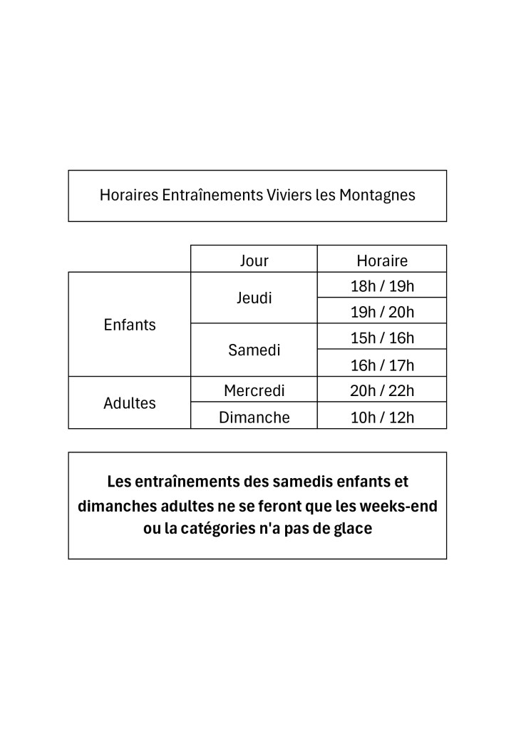 Merci de bien lire le document joint concernant les entraînements du week-end, ils n’auront lieu que les week-end où la catégorie concernée n’aura pas de glace.